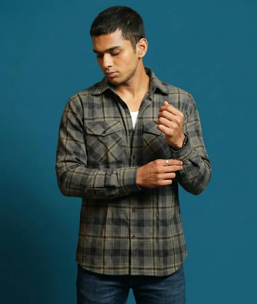 A casual everyday shirt crafted from soft brushed cotton for comfort and warmth. Featuring an earth-toned olive-charcoal base with classic muted plaid checks, it delivers a relaxed yet refined look. Finished in a regular fit, this shirt is ideal for effortless daily wear and laid-back styling.
